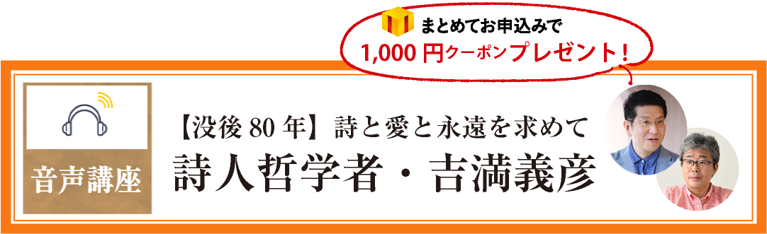 今回の講座では、山本芳久が哲学・神学的な観点から吉満のテクストを精読するとともに、吉満義彦についての著作を有する若松英輔との対談を毎回豊富に加味することによって、吉満義彦を深く読み解くためのまたとない機会を御提供したいと思っています。基本的なことから御説明しますので、予備知識は全く不要です。